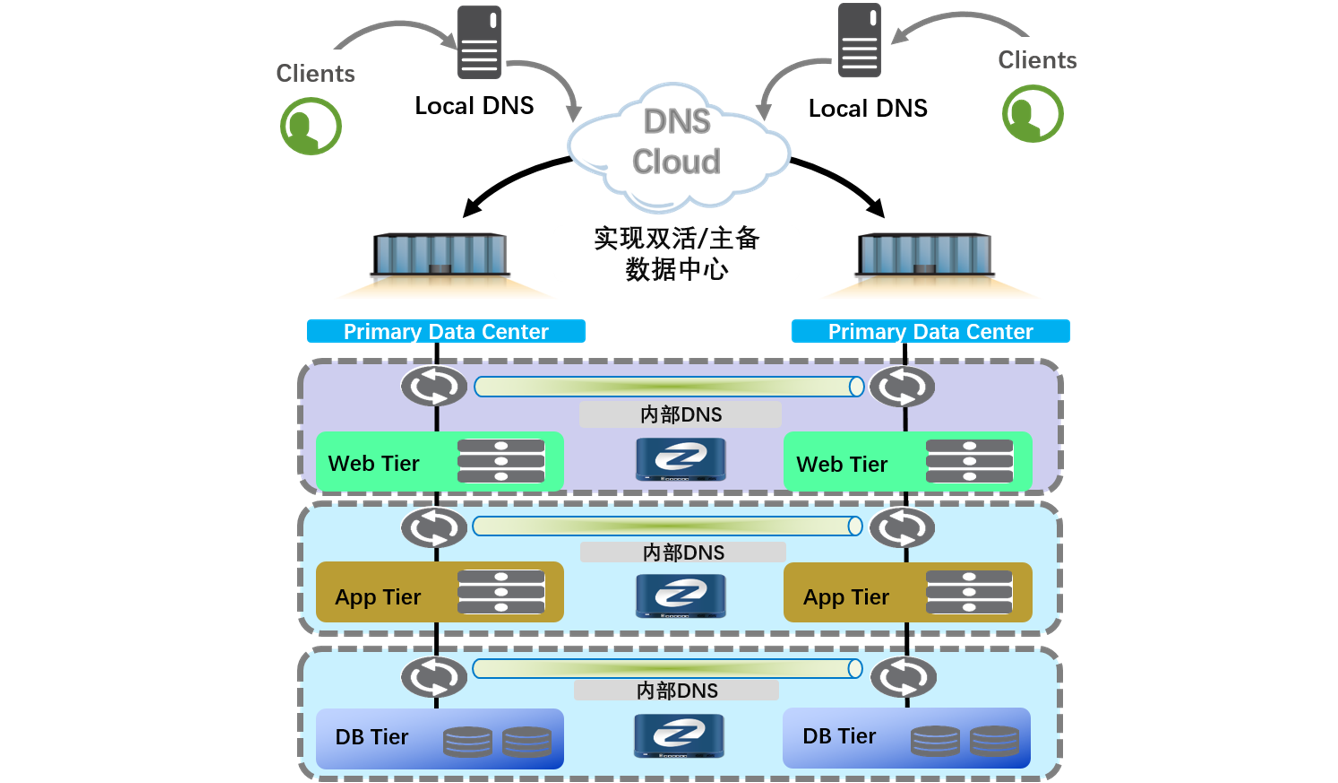 数据中心为提高应用系统的可靠性,实现多站点资源分布式部署,提高资源的利用率,需要多站点的应用系统构建成多活或主备工作模式。为了与IP地址解耦,通常会使用域名系统(DNS)来调度这些应用。evo真人视讯多数据中心域名(DNS)解决方案以IT整体架构为蓝图,以业务陆续在性保障为目标,利用域名解析门户应用调度功能,可将用户访问流量引流到可靠、可用的数据中心进行访问,既能保证用户的使用体验,又能达到应用容灾的无感切换的目的。